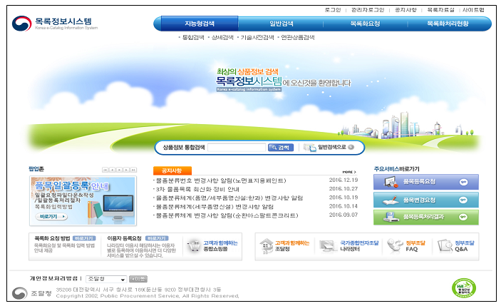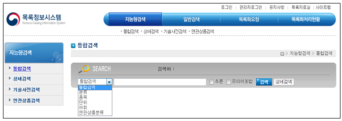 o 목록정보시스템 초기화면 중간의 ‘상품정보 통합검색’ 입력창에 검색어를 입력하고 검색버튼을 누릅니다.