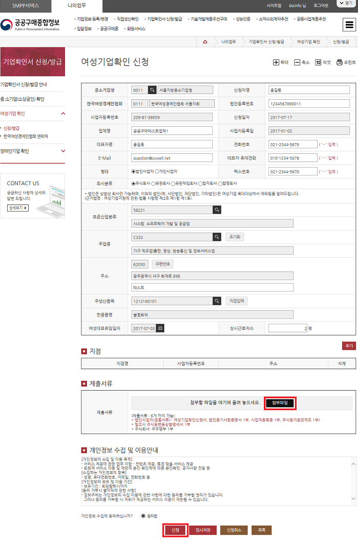 12. 여성기업확인 신청정보 입력 후 저장