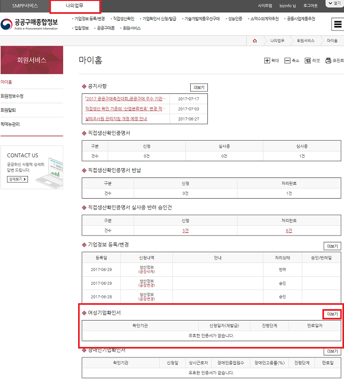 7. 회원서비스-마이홈-여성기업확인서 더보기 클릭