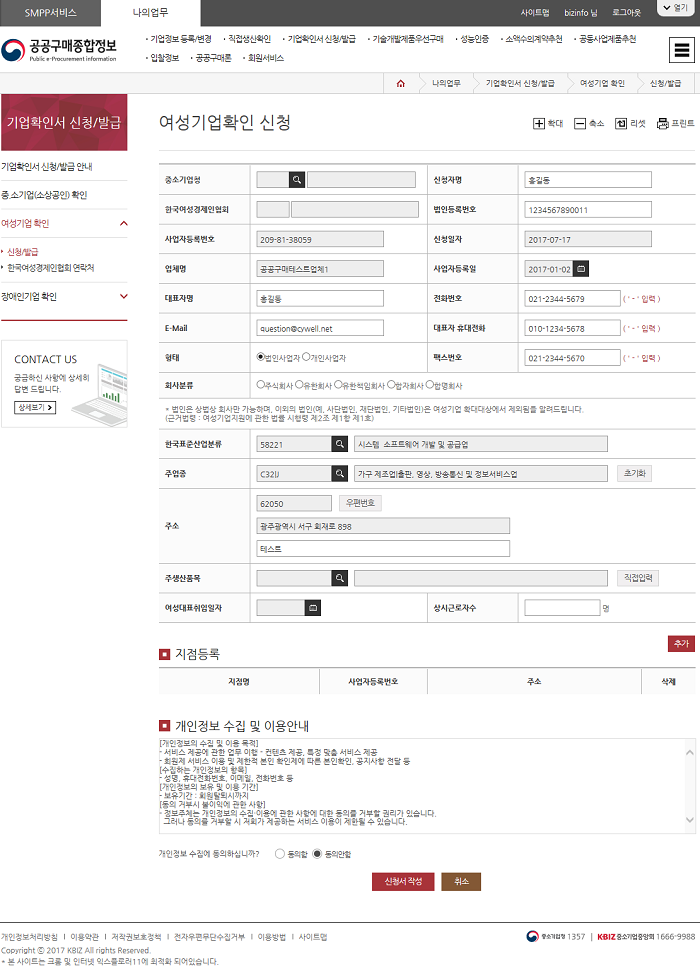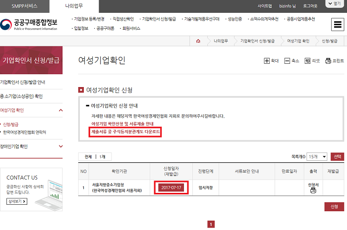 - 14. 여성기업확인 신청화면 확인