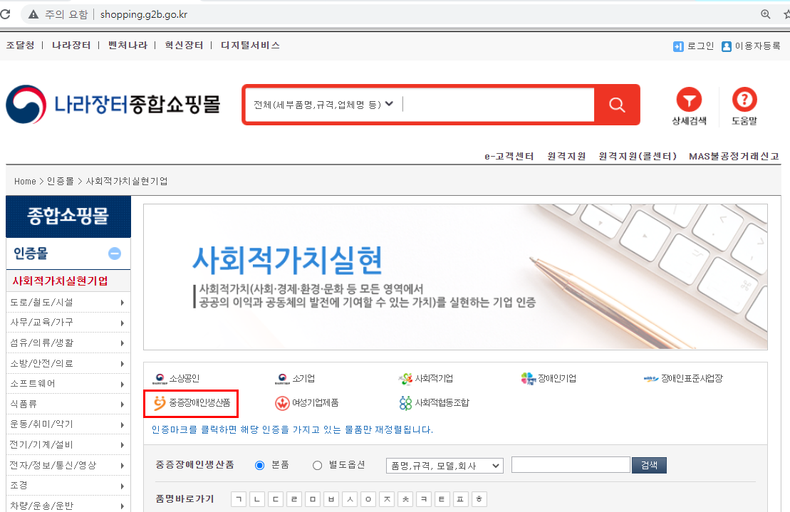 중증장애인생산품은 조달청 나라장터 종합쇼핑몰에서 별도 사이트와 마크가 존재하며 다양한 수요기관에게 우선구매를 요구하고 있습니다.