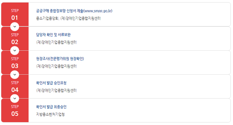 공공구매종합정보망(www.smpp.go.kr) 접속 → 회원가입 → 장애인기업 확인서 신청→행정정보 공동이용 사전 동의 및 자가진단→정보입력 및 신청서류 업로드공공구매종합정보망