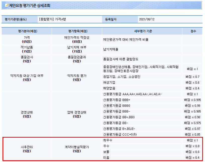 조달청 입찰 또는 제안공고에서 평가된 점수로 인하여 이익 또는 불이익을 받기 때문에 관리가 매우 중요합니다.