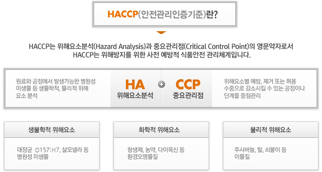 HACCP는 Hazard Analysis Critical Control Point의 약자로『해썹』이라고 발음하며 『안전관리인증기준』으로 통칭하고 있습니다. HACCP 제도는 가축의 사육·도축·가공·포장·유통의 전과정에서 축산식품의 위생에 해로운 영향을 미칠 수 있는 위해요소를 분석하고, 이러한 위해요소를 방지· 제거하거나 안전성을 확보할 수 있는 단계에 중요관리점을 설정하여 과학적· 체계적으로 중점관리하는 사전위해관리 기법입니다.