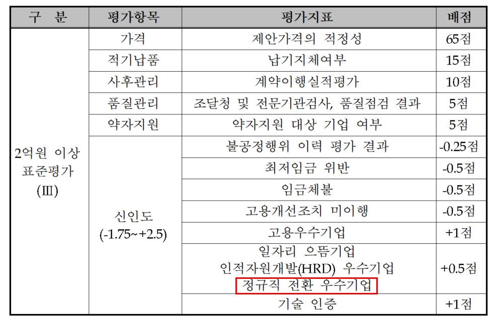 정규직전환기업의 사업승인이 확정되면 조달청 나라장터 종합쇼핑몰에 해당기업 물품에 정규직전환기업 인증이 되고 2단계 경쟁시 가산점을 0.5점 받습니다. 거의 실재로 가산점 0.5점을 받는 다면 받지 않은 기업보다 경쟁에서 우선되기 때문에 받는 것이 매우 유리합니다.