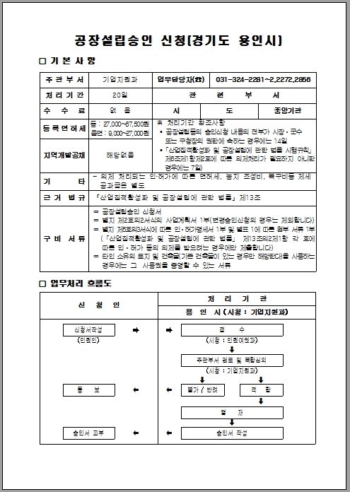 아래 신청서는 용인시의 공장등록신청서 양식입니다.