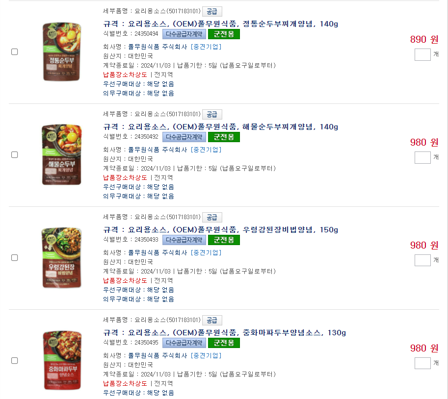 | 1 | 요리용소스 | 5017183101 | 2,400,000 | kg | 납품장소차상도 |