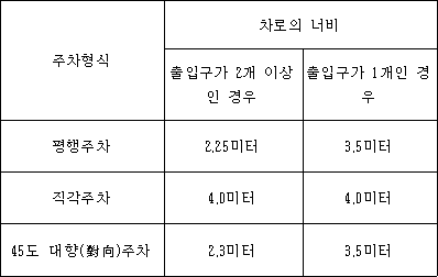 나. 차로의 너비는 주차형식 및 출입구(지하식 또는 건축물식 주차장의 출입구를 포함한다. 제4호에서 또한 같다)의 개수에 따라 다음 구분에 따른 기준 이상으로 하여야 한다.