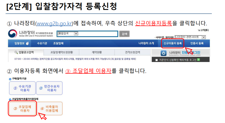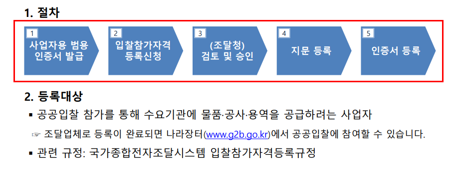 조달청을 통해서 공급업체로 물품 및 서비스를 제공하기 위해서는 조달업체로서 등록을 해야 입찰 및 다른 방법으로 국가를 상대로 비즈니스를 할 수 있습니다.