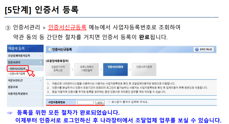 조달청에 인증서를 등록하고 사용해야 비로소 조달입찰참가 등록이 가능합니다.^^*