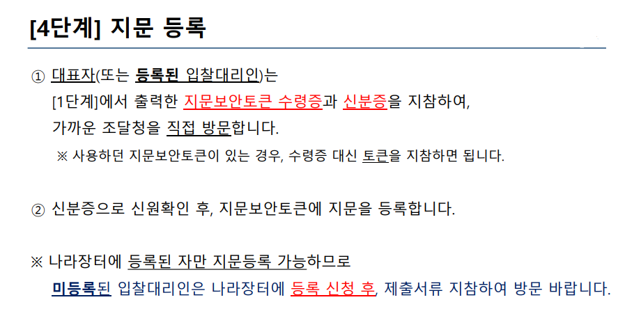 입찰을 참여하기 위해서는 조달청에 방문하여 지문을 등록하며 3명까지 등록할 수 있습니다.