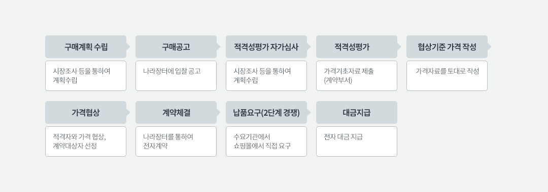 가격협상이 완료된 3인 이상의 계약상대자와 다수공급자계약을 체결하여 종합쇼핑몰에 등록(계약기간은 3년 원칙)