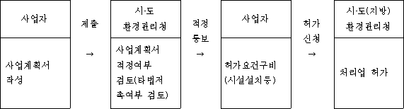 ※ 환경관리청장 또는 시?도지사(이하 “허가권자”라 한다)는 사업자로부터 폐기물처리사업계획서 2부(배출시설에 해당하는 폐기물처리시설을 설치하지 아니하는 경우에는 1부)를 제출받아 1부는 처리업사업계획 적정여부를 검토하고, 1부는 배출시설설치허가기관에 검토의뢰