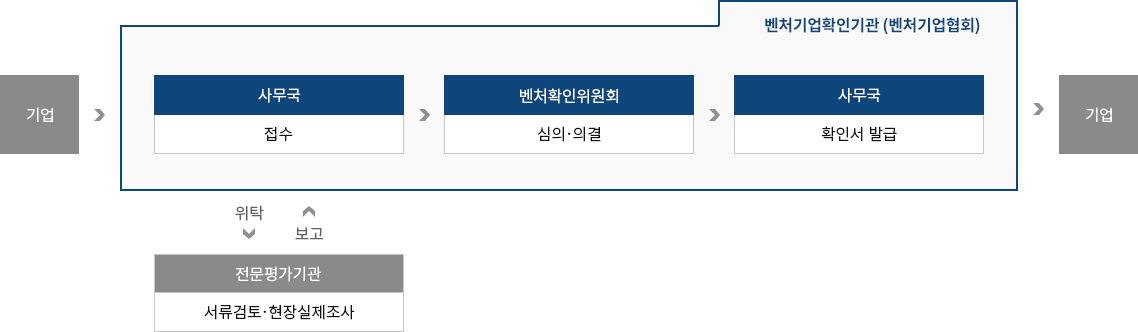 「벤처기업육성에 관한 특별조치법」에 규정된 일정 요건을 갖추고 기술의 혁신성과 사업의 성장성이 우수한 기업을 벤처기업으로 발굴하고 지원해 주는 제도이며 1998년 시행 이후 지속적인 법개정을 거쳐, 2021년 2월 12일 혁신성·성장성 중심의 ‘민간주도 벤처기업확인제도’로 전면 개편되어 시행 중 입니다. 벤처기업 확인을 위한 전체 과정(신청·평가·심의·의결)을 벤처기업확인기관을 통한 단일 창구로 진행합니다.