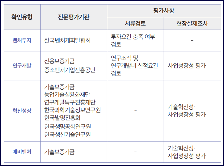 | 벤처투자유형 | 1.「중소기업기본법」제2조에 따른 중소기업일 것 2. 투자금의 총합계가 5천만원 이상일 것 3. 기업의 자본금 중 투자금액의 합계가 차지하는 비율이 10% 이상일 것 ※ 적격투자기관 : ①창업투자회사 ②창업투자조합 ③신기술금융업자 ④신기술투자조합 ⑤벤처투자조합 ⑥한국벤처투자㈜ ⑦전문개인투자자 ⑧개인투자조합 ⑨산업은행 ⑩기업은행 ⑪은행 ⑫경영참여형 사모집합투자기구 ⑬외국투자회사 창업기획자(액셀러레이터) 크라우드펀딩(전문투자자 3천만원 이상 투자) 농림수산식품투자조합 산학연협력기술지주회사 공공연구기관첨단기술지주회사 신기술창업전문회사 ⑳기술보증기금 신용보증기금 |