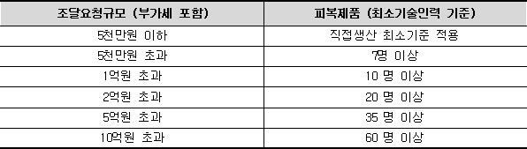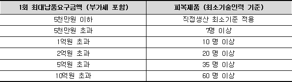 2. 피복류 다수공급자계약시 최소기술인력기준은 아래와 같이 정하며, 1회 최대납품요구금액에 따른 최소기술인력 산출은 직선보간법을 적용하여 산출한다.