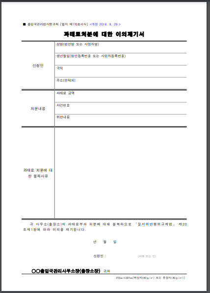 행정청의 과태료 부과에 불복하는 당사자는 과태료 부과 통지(사전통지가 아닌 과태료 부과 고지서에 의한 통지를 말함)를 받은 날부터 60일 이내에 해당 행정청에 서면으로 이의제기를 할 수 있습니다(「질서위반행위규제법」 제20조제1항).