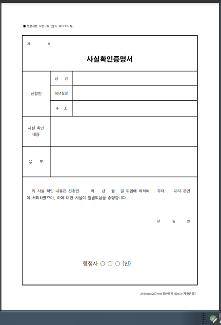 사실확인증명서는 행정사의 고유한 권한으로 권리관계 각종 서류 또는 일정한 사실관계가 존재함을 증명하는 서류입니다. 사실확인증명서는 대한민국 국가기관에서 인정하는 공식 확인 서류로서 사실이 확인을 증명하는 서류가 됩니다.