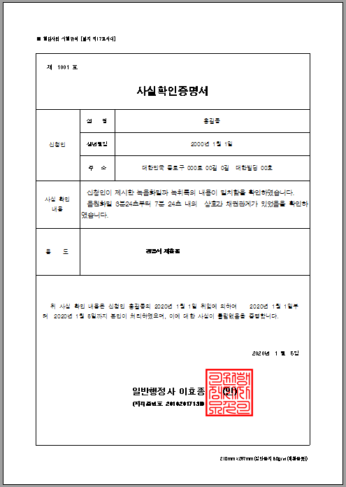 행정사가 제시한 문서는 행정사법의 명기된 서실이며 상위 서식도 행정사법 시행규칙에 명기된 양식으로 작성된 서류입니다. 행정사는 법적인 자격증이기 때문입니다.