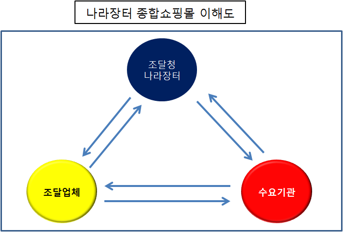 입점된 물품을 수요기관에서 온라인 나라장터 종합쇼핑몰에서 해당 물품을 구매하면 조달청은 구매내역을 조달업체에게 전달하고 조달업체는 거래조건에 따라 제조된 물품 또는 서비스를 수요기관에 납품하고 수요기관은 이를 확인하고 조달청 나라장터에 확인 전송할 경우 조달청에서는 해당 금액을 조달업체로 공급하는 시스템입니다.