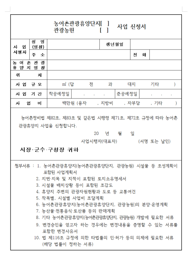 관광농원의 사업신청서는 아래에 있는 서식으로 신청하며 신청을 하고 약 30일에서 60일 정도 소요됩니다.