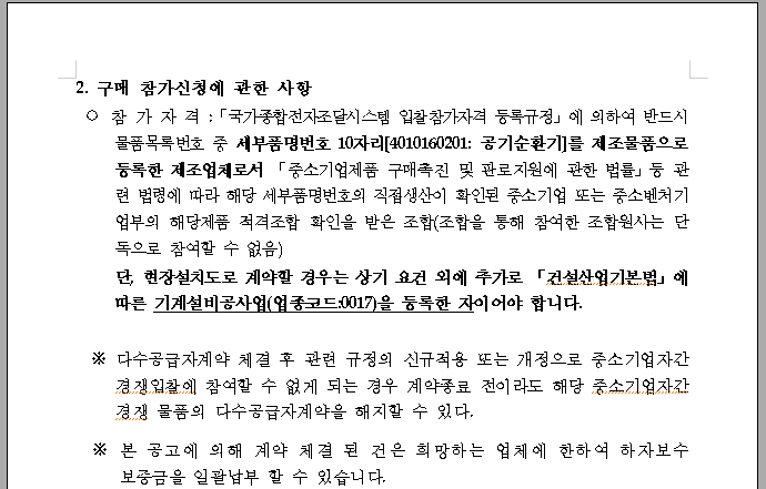 공기순환기 제조물품으로 등록한 제조업체만 조달을 등록할 수 있는 경우입니다. 다시 말해서 공장등록을 하고 직접생산증명을 공기순환기로 한 업체만 등록할 수 있다는 것입니다.
