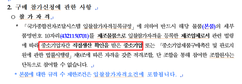 위에 화면처럼 표시가 되는 제품은 모두 직접생산확인을 받아야 하며, 필수로 중소기업이면서 공장을 보유한 업체이어야 합니다.