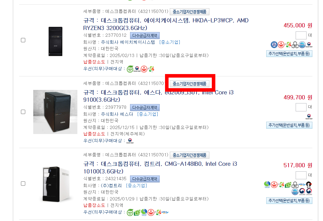 다수공급자계약중에서 직접생산확인이 필요한 제품군은 중소기업간 경졍제품으로 아래 화면으로 표시됩니다.