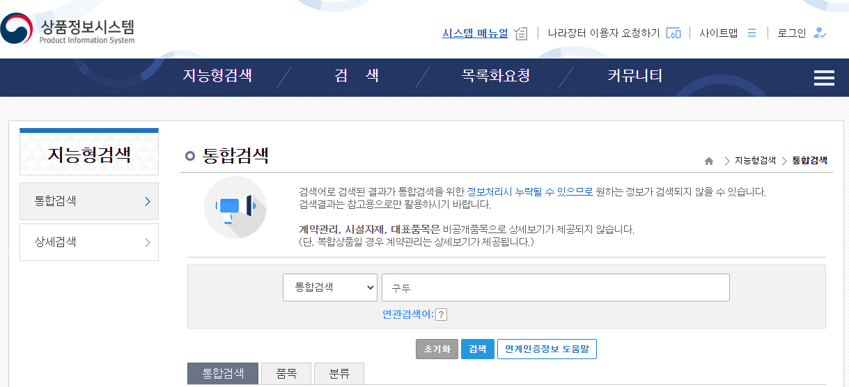 나라장터종합쇼핑몰 (http://shopping.g2b.go.kr/)에서 적색 부분을 클릭하면 다음 화면이 나오고 여기에 공급하고자 하는 물품을 검색할 수 있습니다. 예시는 남성용 구두에 대해서 검색을 했습니다.