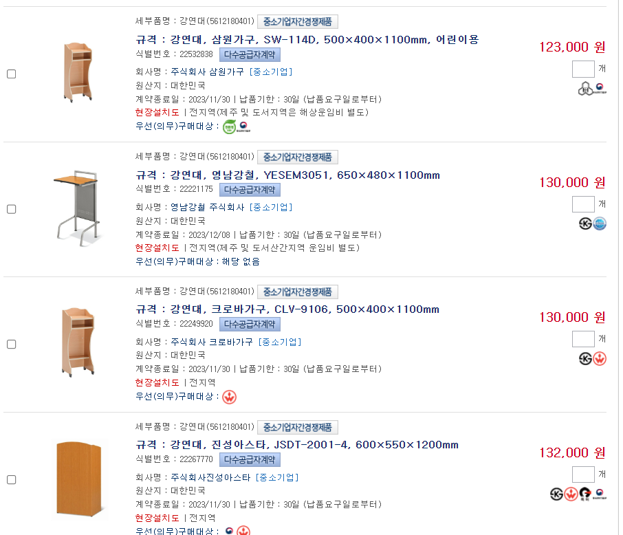 – 수요기관에서 공통적으로 필요로 하는 수요물자를 구매함에 있어 수요기관의 다양한 수요를 충족하기 위하여 필요하다고 인정되는 경우, 품질·성능 또는 효율 등이 같거나 비슷한 종류의 수요물자를 수요기관이 선택할 수 있도 록 2인 이상을 계약 상대자로 하는 공급계약을 체결하는 것으로 체결되면 아래처럼 표출됩니다. 수요기관의 입장에서는 소량제품을 상기 구매할 수 있는 장점이 있습니다.