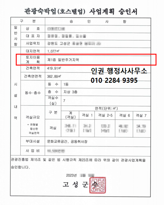 해당 지역은 강원특별자치도 고성군에 관광숙박업(호스텔업)을 사업계획 승인 받아서 현재 등록하고 영업중입니다. 처음에 고성군청에서는 일반주거지역은 조례상 숙박업이 불가능지역이라고 상담을 했으나 위에 자료로 설득을 하고 업무를 처리하게 되었습니다. 일반주거지역에서는 위에 규정을 엄격하게 준수하여 사업 및 건축계획으로 관광진흥법에 따라 사업계획 승인신청을 하고 지자체 담당자에게 설득하는 과정이 있어야 합니다. 따라서 전문 행정사가 있어야 가능한 사업입니다.