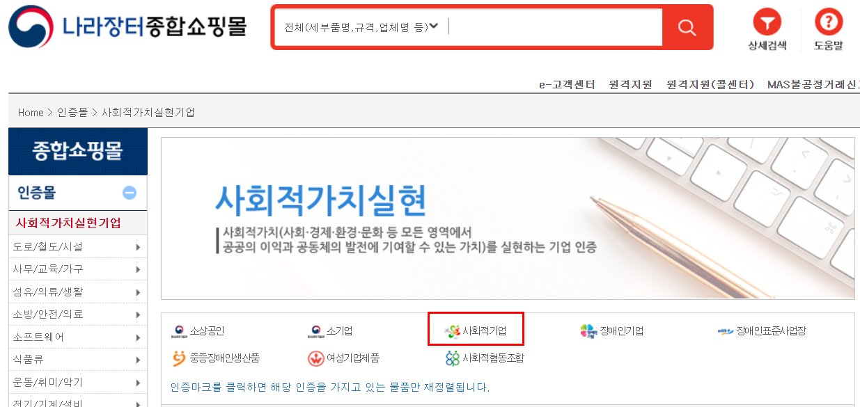조달청 나라장터 종합쇼핑몰에서 사회적기업 인증기업을 우대하고 있습니다.