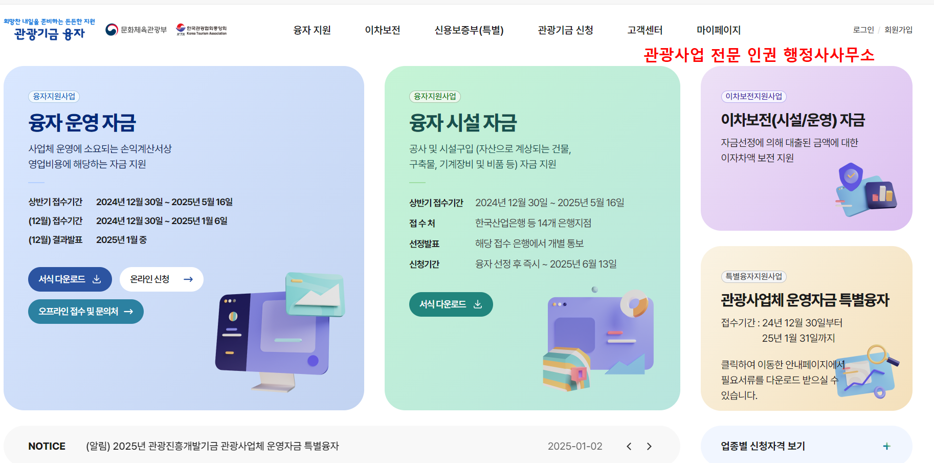 | 접수처 | 업종별 관광협회 및 시·도 관광협회, 한국관광협회중앙회 등 *등기우편 또는 방문접수 *온라인 접수(www.loantourism.kr) |