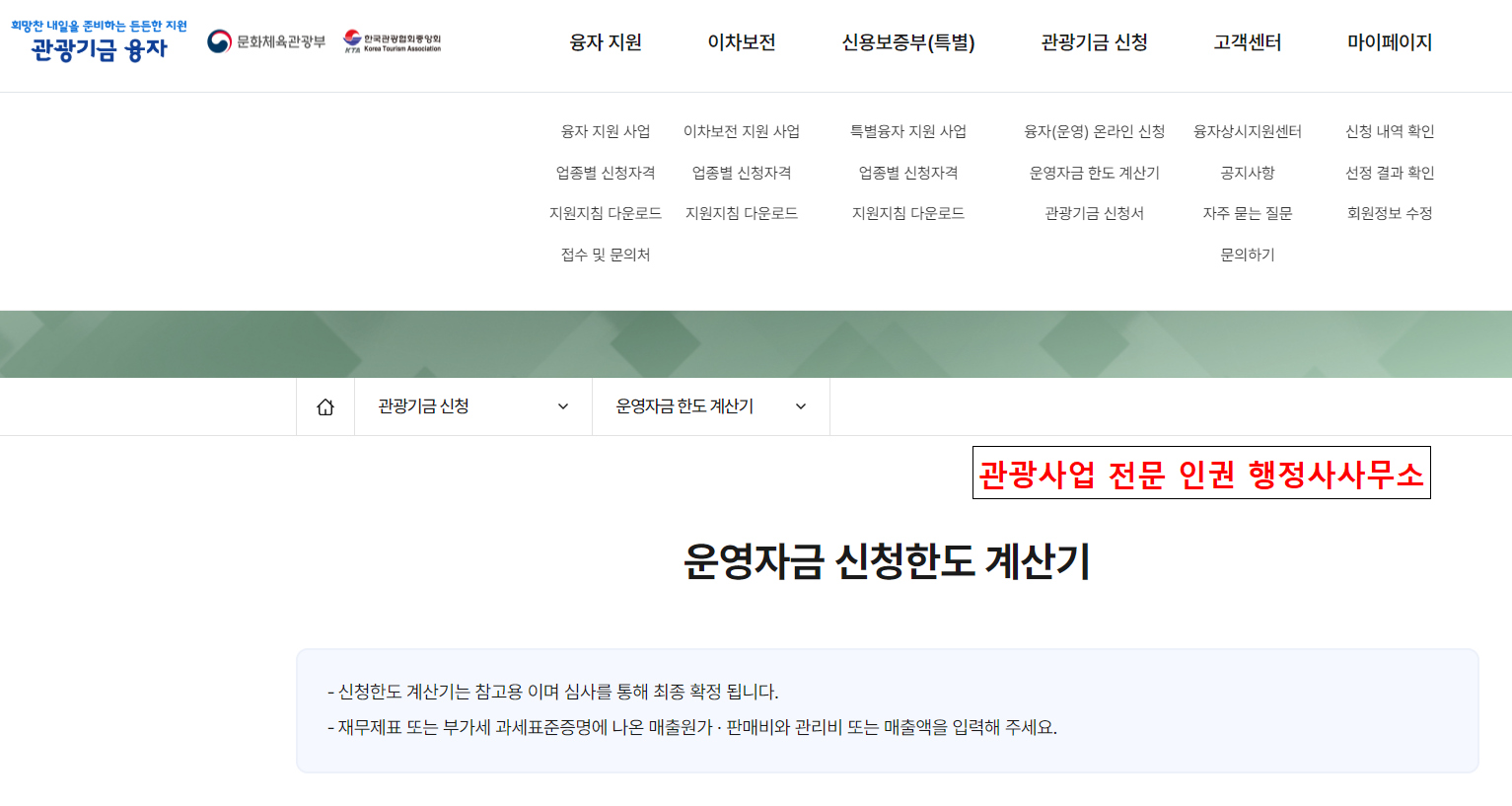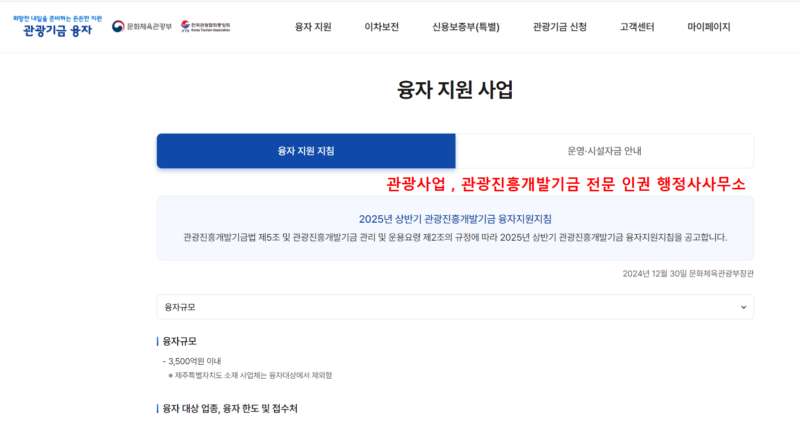 | 접수처 | 업종별 관광협회 및 시·도 관광협회, 한국관광협회중앙회 등 *등기우편 또는 방문접수 *온라인 접수(www.loantourism.kr) |