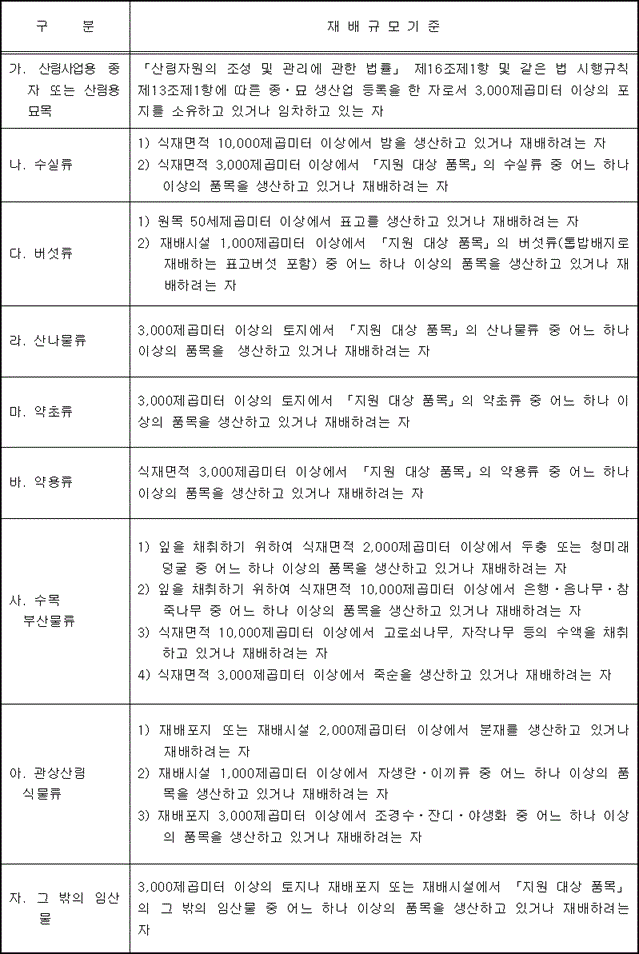 3) 산림청이 고시*한 ‘임업후계자 요건의 기준(1,000㎡ ~10,000㎡ )’ 이상의 산림용 종자, 산림용 묘목(조경수 포함), 버섯, 분재, 야생화, 산채, 그 밖의 임산물을 생산하려는 자로 임업분야 40시간 이상 교육을 이수(임업관련 대학교·고등학교 졸업 시 면제)하고 기준 규모 이상의 재배포지 및 사업계획을 수립한 자(연령 무관)