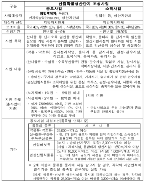 - 종자 종묘, 임산물 생산 재배를 위한 시설 기계장비 및 비료 등 임산물 소득원 지원 대상 품목의 생산 재배 유통 가공 관리에 소요되는 것 일체 (임야매입 임차 가능)