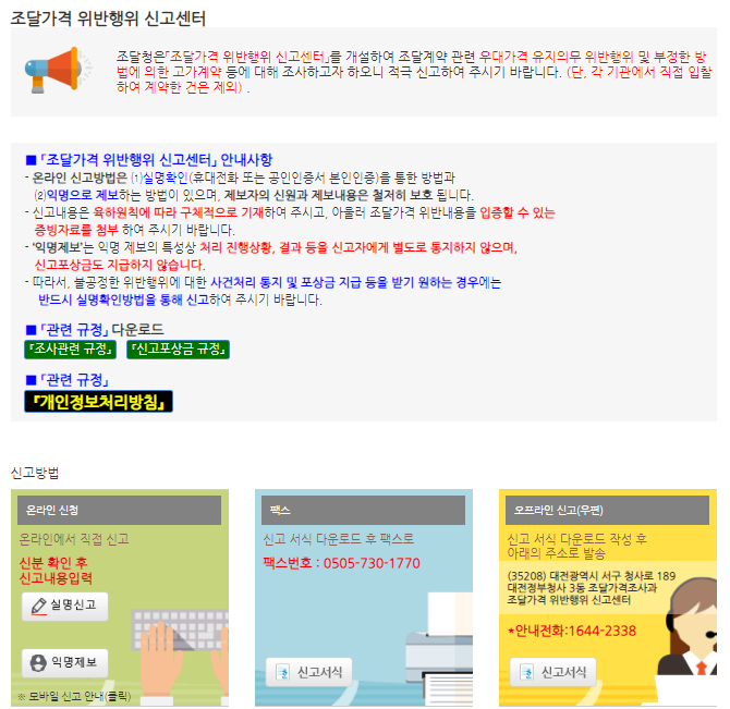 ○ 조달청은 ‘조달가격 위반행위 신고센터’의 온라인창구 및 오프라인창구(팩스·우편)를개설하여 조달가격 위반행위에 대해 조사하고 신고포상금을지급하고 있으니 적극 신고하여 주시기 바랍니다.