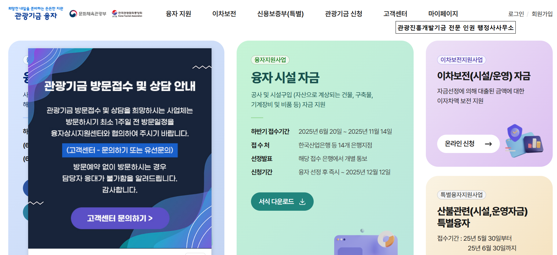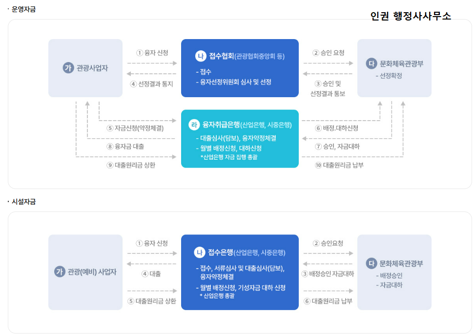 | 접수처 | 업종별 관광협회 및 시·도 관광협회, 한국관광협회중앙회 등 *등기우편 또는 방문접수 *온라인 접수(www.loantourism.kr) |