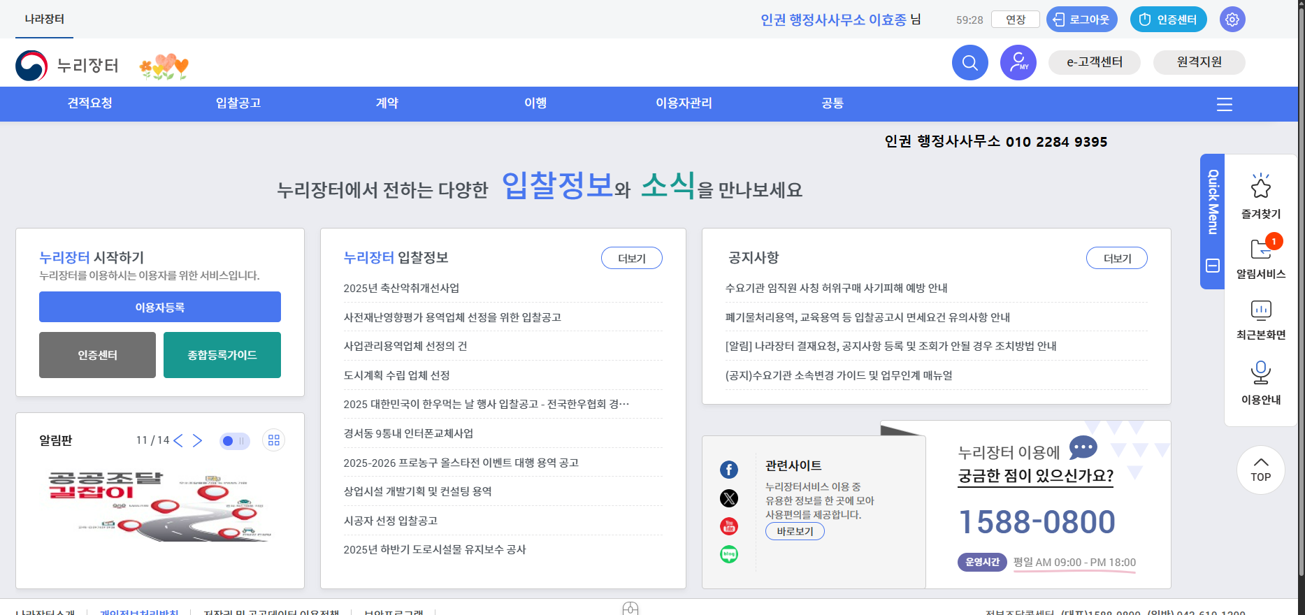위에 누리장터에서 입찰을 진행하고 투찰을 진행할 수 있습니다.