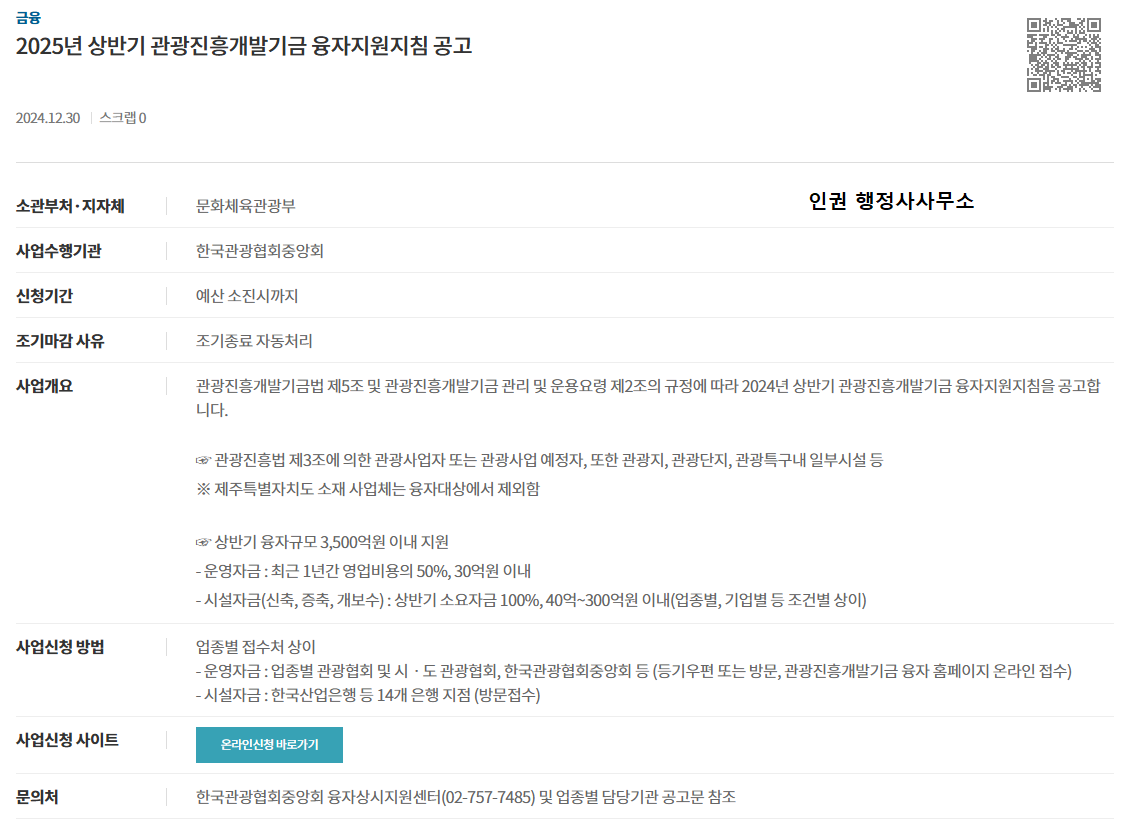 | 신청서류 접수기간 | 2024.12.30.(월) ~ 2025.5.16.(금) * 신청기간 중 1회에 한하여 신청 가능하며, 예산 소진 시 조기 종료될 수 있음 |