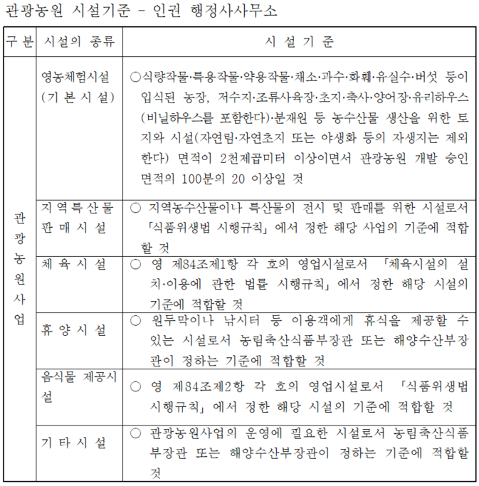 농어촌정비법 제81조제2항, 동법 시행규칙 제47조 및「별표 3」농어촌관광 휴양사업의 규모 및 시설기준