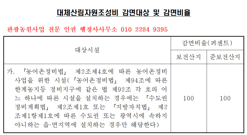 아래 규정에 따라 관광농원사업은 대체산림자원조성비가 100% 감면됩니다.