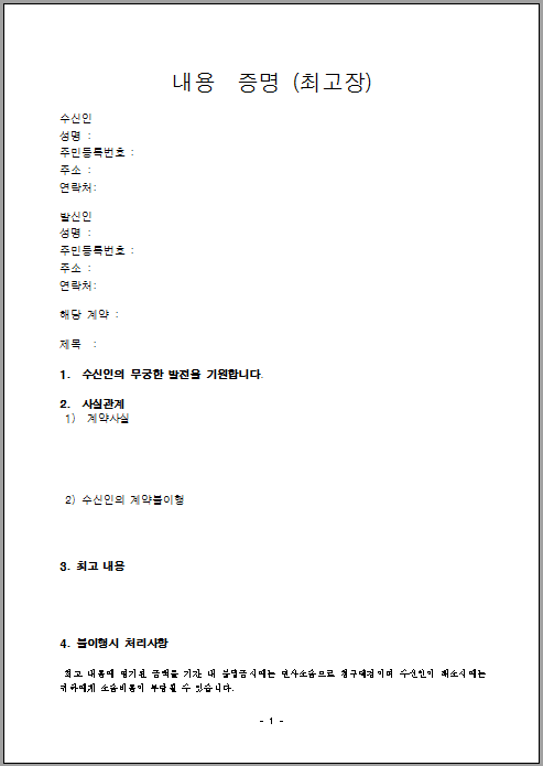 내용증명의 형식은 특별한 것이 없으나 대중적인 것은 발신인과 수신인의 성명, 주민등록번호, 주소, 연락처를 적고 발신인과 수신인의 법률관계를 명확히 하는 것이 좋습니다.