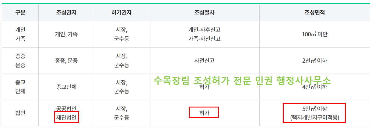 수목장림 조성은 개인/가족, 종중/문중, 종교단체, 공공법인 맟 재단법인이 할 수 있습니다. 특히 중요한 것은 조성절차는 허가이며,조성면적은 5만제곱미터 이상입니다. 다른 신청인이 미만이거나 이하이지만 재단법인은 5만제곱미터 이상입니다.