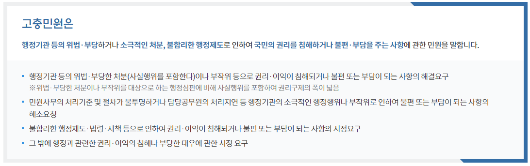 “고충민원”이란 행정기관등의 위법ㆍ부당하거나 소극적인 처분(사실행위 및 부작위를 포함한다) 및 불합리한 행정제도로 인하여 국민의 권리를 침해하거나 국민에게 불편 또는 부담을 주는 사항에 관한 민원(현역장병 및 군 관련 의무복무자의 고충민원을 포함한다)을 말한다.