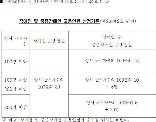 장애인 10명 이상, 상시근로자 중 장애인을 30% 이상(상시근로자 수에 따라 중증장애인 고용의무의무 차등 적용)을 고용, 상시근로자 기준은 1개월에 16일 이상 60시간 이상 근무한 자를 말합니다.