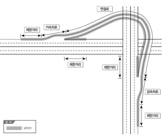 - [예시도] 변속차로가 설치되었거나 설치예정인 평면교차로의 연결 금지구간