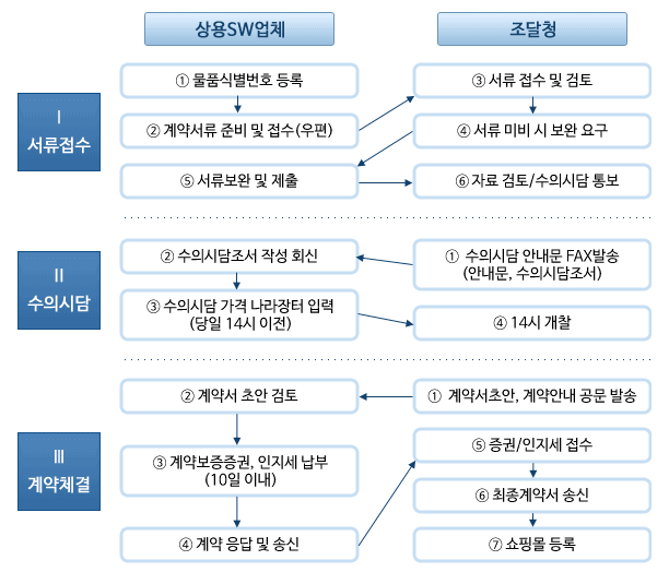 상용소프트는 조달청에서 상시 계약을 진행하고 있으며, 이를 상용소프트웨어의 제3자단가계약이라고 합니다. 주의 해야 할 것은 조달청에서는 일정 조건이 해당될 때만 조달청과 계약을 진행할 수 있습니다. 특히 중요한 것은 조달청 계약과 더불어 이후 조달사업에 대해서 신중히 고려해야 합니다. 결국은 매출을 올리기 위해서 조달사업을 하는 것이기 때문에 조달사업과 관련된 종합 사업계획을 수립하고 진행하시는 것이 매우 중요합니다.