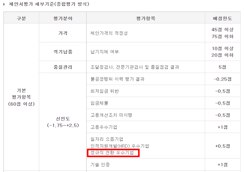 정규직전환기업은 특히 조달사업에서는 매우 중요한 가산혜택이 있습니다. 조달청 다수공급자계약에서 2단계 경쟁제도에서는 신인도에서 가산점이 있다는 것은 매우 중요하기 때문에 이를 이유로 혜택을 보기 위해서 준비하시는 경우가 많이 있습니다.