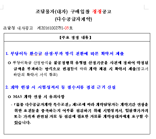 아래는 버스승강장에 관련된 공고로서 정식 명칭은 "조달물자(내자) 구매입찰 정정공고"입니다.
